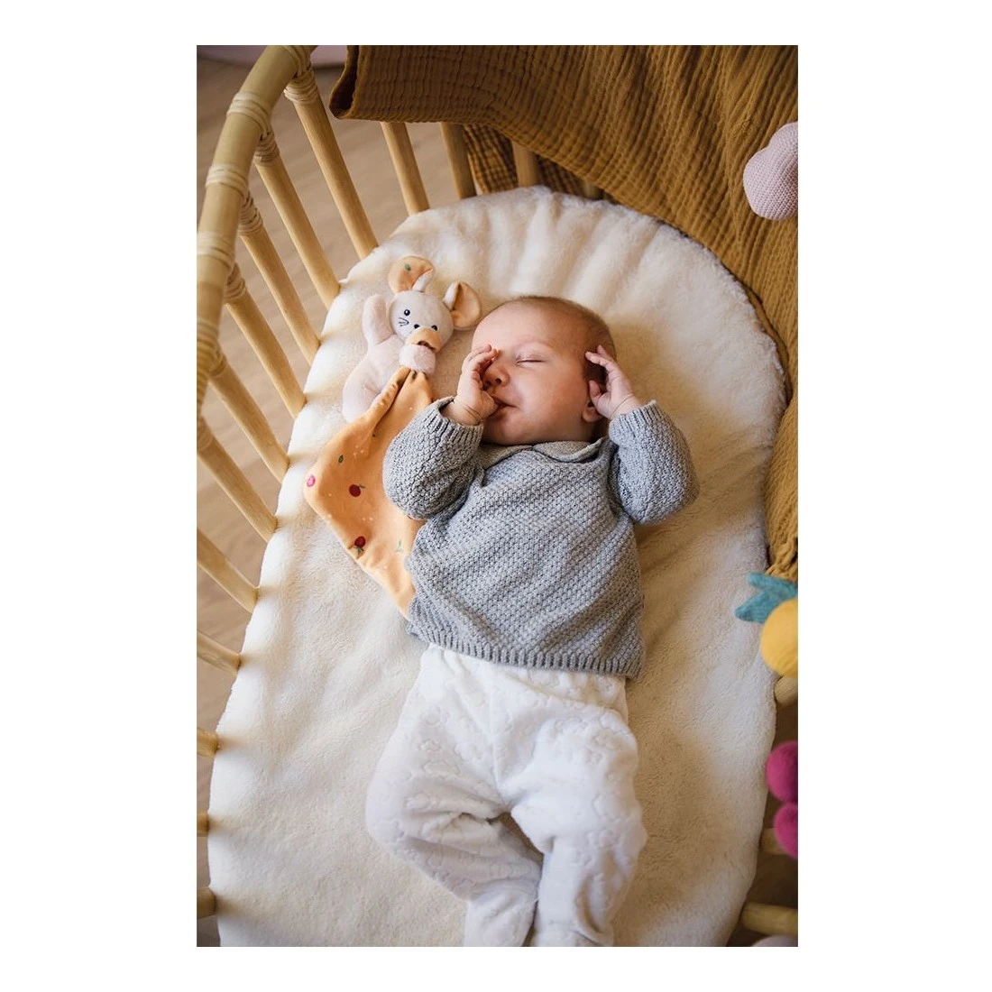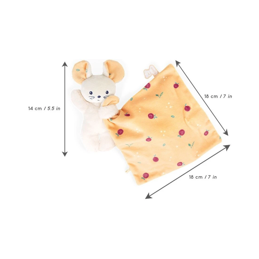 Ce de douceur sera le compagnon préféré de bébé. Avec son petit corps moelleux en micro-velours, la petite souris est facile à agripper. Le doudou plat jaune tenu entre ses mains est orné de pommes rouges. Cet imprimé délicat et poétique se retrouve également dans les oreilles de la souris.
