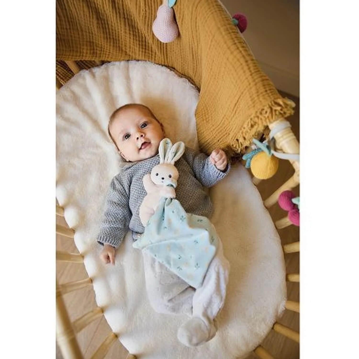 Ce doudou lapin enveloppĂ© dans son carrĂ© de douceur sera le compagnon prĂ©fĂ©rĂ© de bĂ©bĂ©. Avec son petit corps moelleux en micro-velours, le lapin est facile Ă agriper et Ă tenir par le corps ou ses longues oreilles. Le doudou plat vert d’eau carrĂ© entre ses mains est habillĂ© de citrons qui partagent l’espace avec de petites fleurs blanches. Cet imprimĂ© dĂ©licat et poĂ©tique se retrouve Ă©galement dans les oreilles du lapin. PrĂ©sentĂ© dans un bel Ă©crin, ce dernier peut ĂŞtre rĂ©utilisĂ© comme Ă©tui de rangement. Son tissu et son rembourrage sont fabriquĂ©s Ă base de polyester recyclĂ© issu de bouteilles en plastique, ce doudou est 100% Ă©coresponsable.