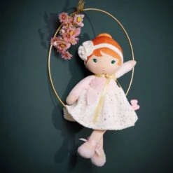 Habillée d’un cache-coeur rose poudré réhaussé d’un foulard doré et d’une jupe toute douce à imprimé d’étoiles champagne, Valentine révèle un style délicat et raffiné. Sa chevelure rousse la différencie des autres poupées en tissu Tendresse de Kaloo.