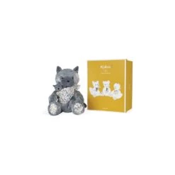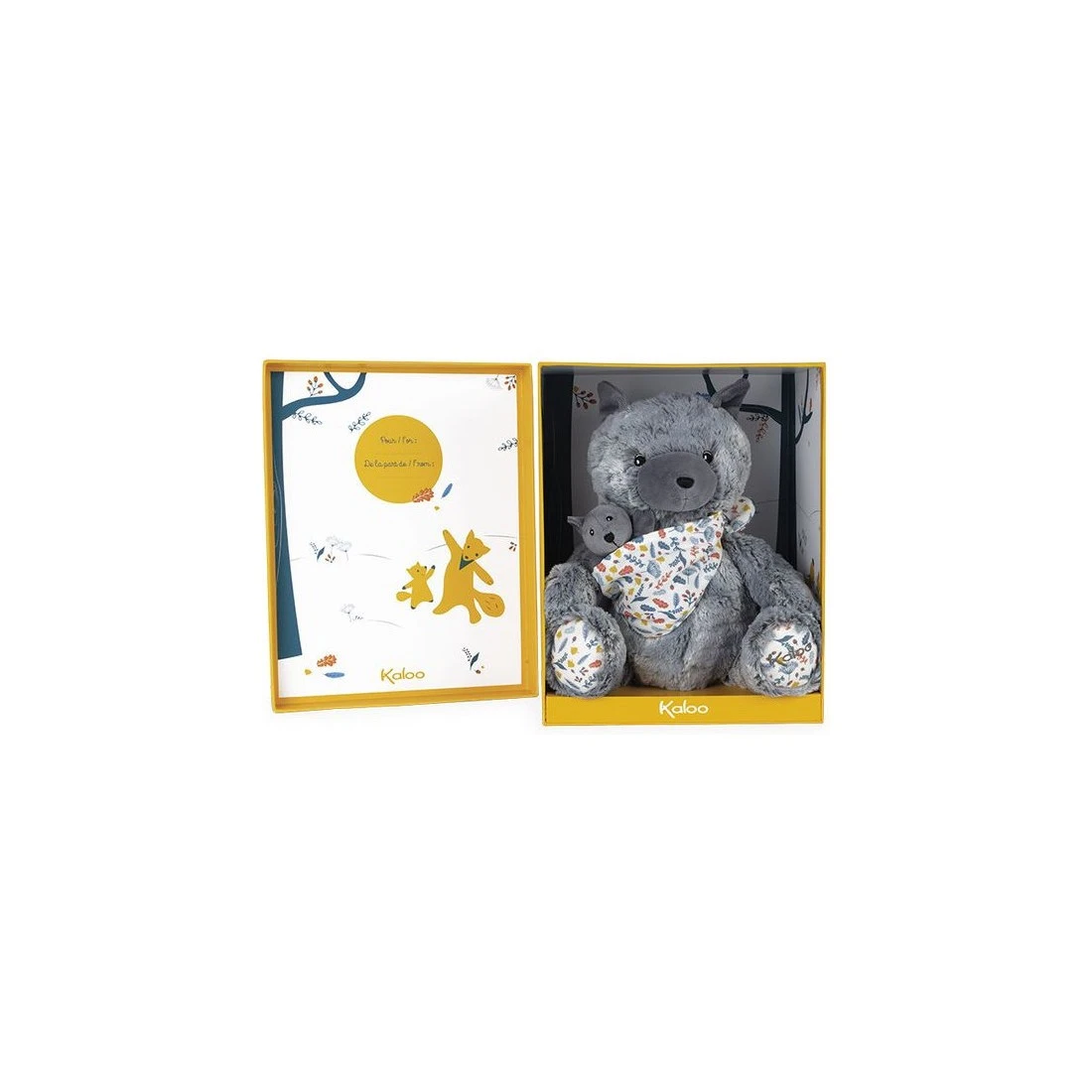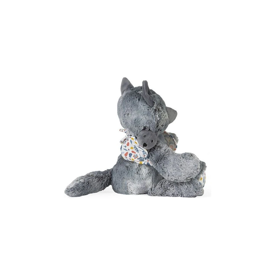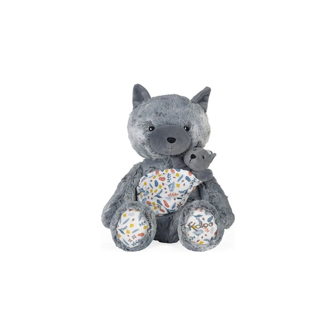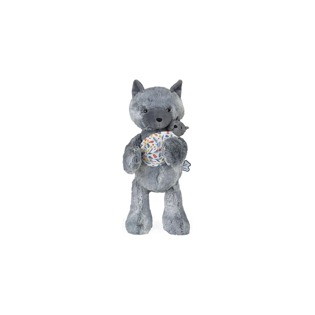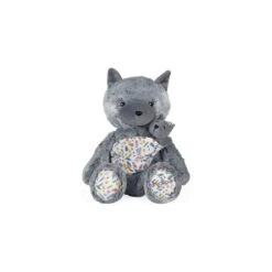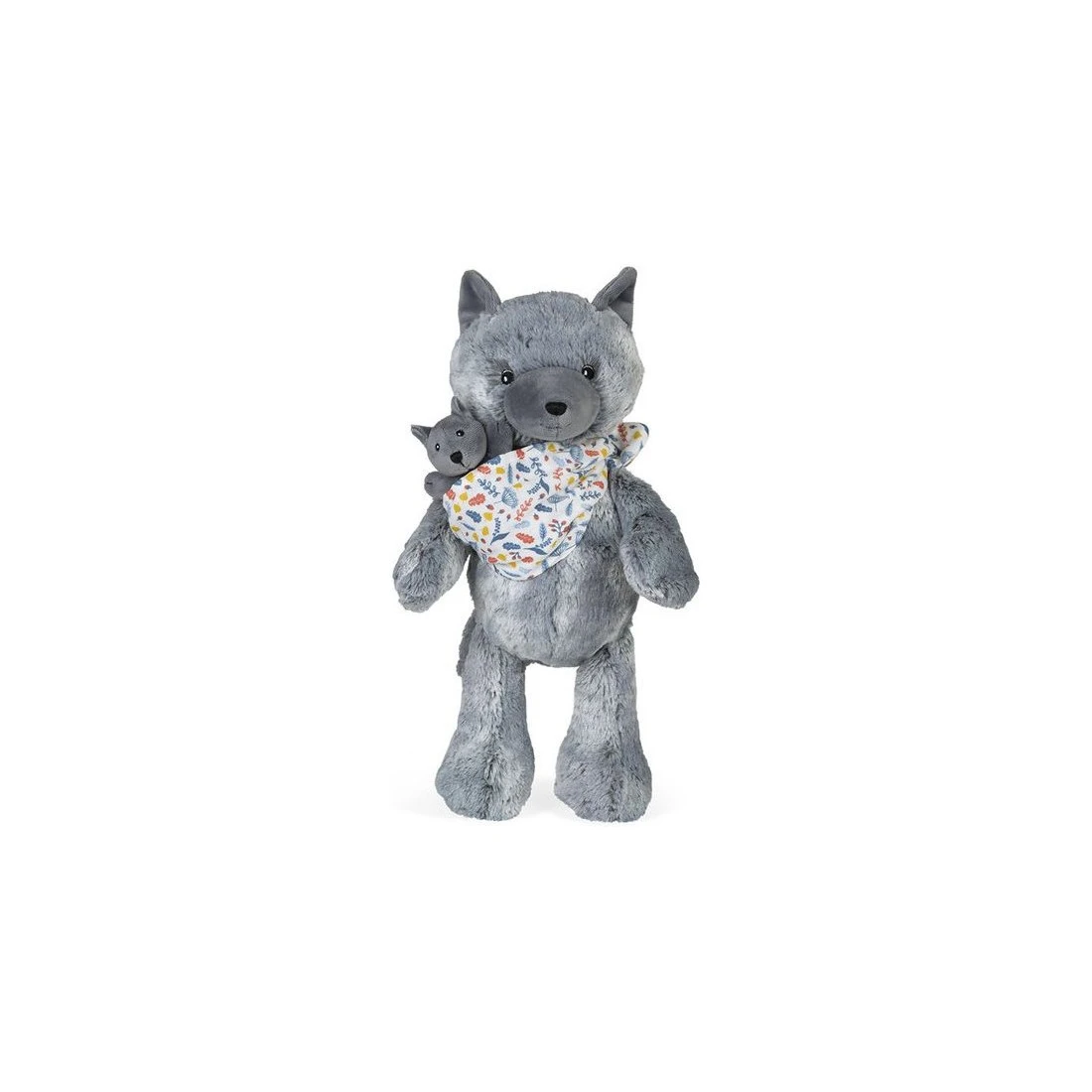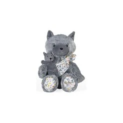 Maman Louve Louise est une peluche moelleuse en fourrure bi-colore grise toute douce. Elle tient tendrement son louveteau dans un porte-bébé en mousseline de coton avec un bel imprimé « sous-bois ».